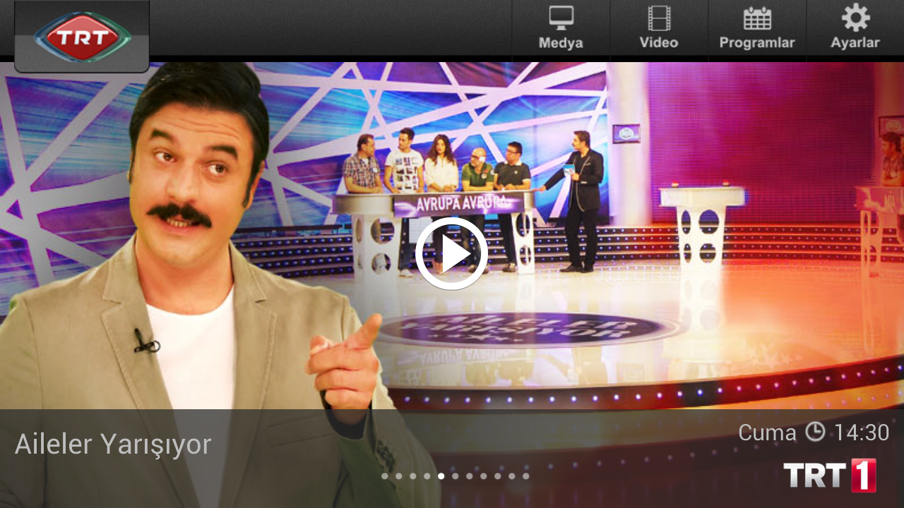 Trt 1 kanalında yayınlanan maçların ve programların ileriye dönük 30 günlük akışı aşağıda ayrıca trt 1 kanalında canlı yayınlanan spor programlarının günlük akışına da listelerimizde yer vermekteyiz. Dizi filmleri ve farklı programları ile gündemde kalmaya devam ediyor. Bu kanal ulusal bazda yayın trt yıllarca tek kanal ve siyah beyaz olarak yaptığı programlarla türkiye'yi her daim bilgilendirmeyi. Pelin çift ile gündem ötesi. Trt 1 türk sineması kuşağı,trt 1 yabancı sinema kuşağı. Türkiye'den ve dünyadan haberler için youtube kanalımıza abone olun. Trt 1 yayın akışı geçmişte sadece spor programları ve eurovision yayınlarıyla sınırlı değildi, kanal bir dönemin. Trt ekranındaki tüm eski içerikler, trtarsiv.com'da. Trt 1 ana haber bülteni saati öğrenilebilir. Diziler, belgeseller, çizgi filmler, programlar bütün kanallar trt 1 trt 2 trt belgesel trt haber trt spor trt spor yildiz trt müzi̇k trt. Bağlantı yoluyla gidilen dış sitelerin içeriklerinden trt sorumlu değildir. Kanalı, 31 trt'nin ekran yüzü olan trt1, geçmişten geleceğe uzanan çizgisinde kumandaların 1. Trt 1 resmi web sitesi.